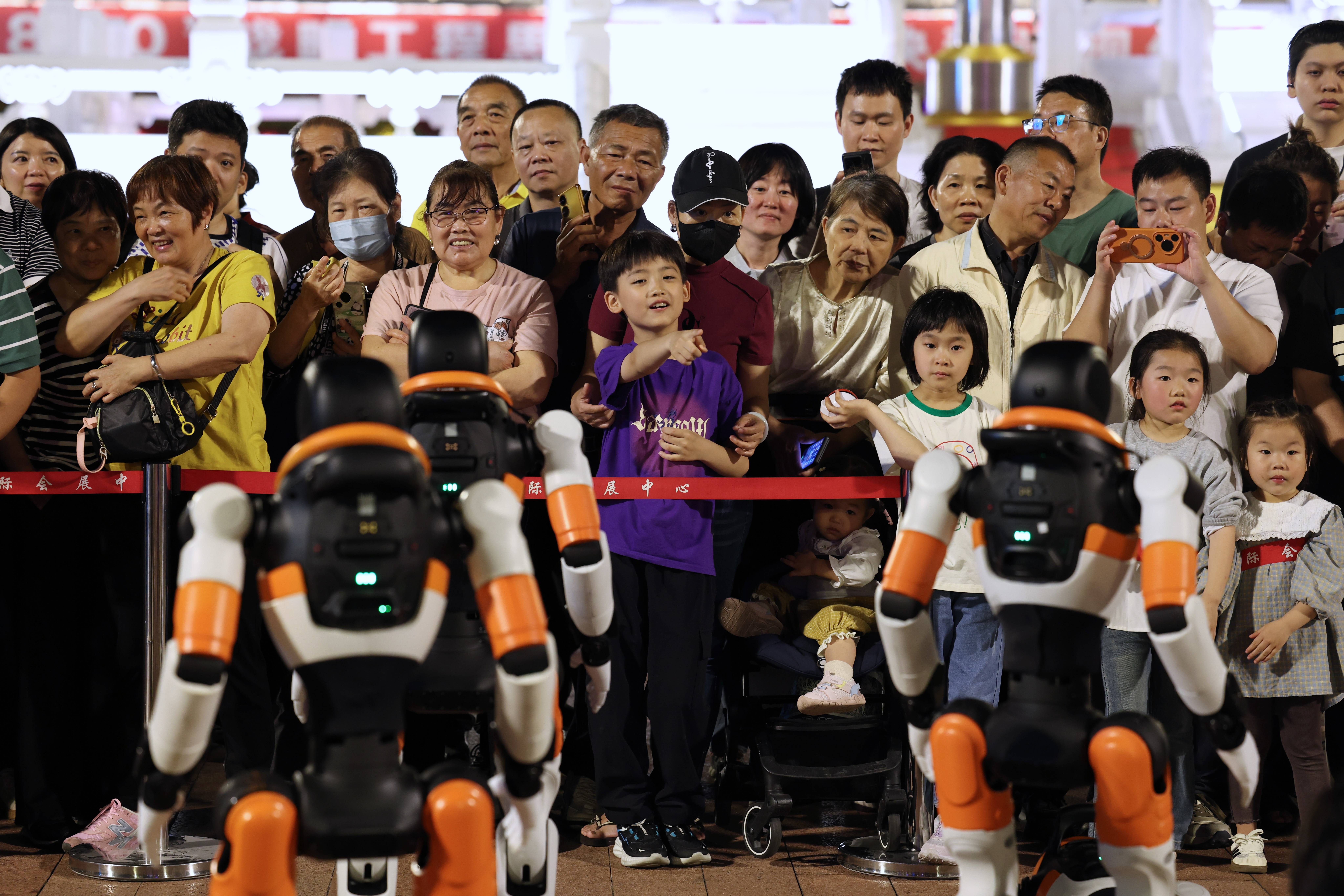 4月19日,在福州五一广场,市民不雅看机器东说念主扮演。新华社记者姜克红 摄看成第九届数字中国缔造峰会预热行为之一,路演行为一开场就燃烧了不雅众的暖和。“太酷了!有益带孩子来感受科技的魔力。”福州市民吴女士一手牵着8岁的女儿,一手拍摄精彩倏地。孩子踮着脚尖属目着舞台,师法机器东说念主的动作轻声说:“姆妈,我以后也要造机器东说念主。”