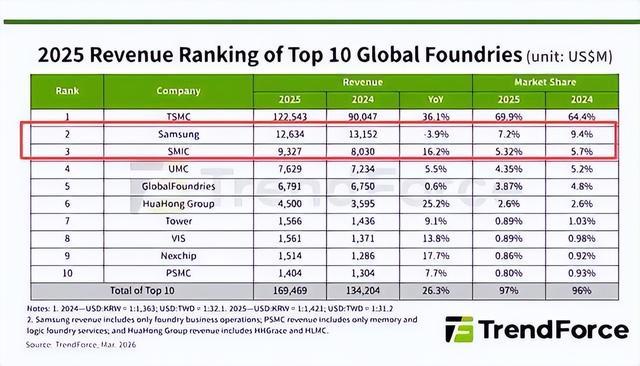 2025年的数据贯通,在全球芯片代工市集上,三星再次下滑了3.9%,份额照旧独一7.2%了,而中芯国外则增长16.2%,份额达到了5.32%。