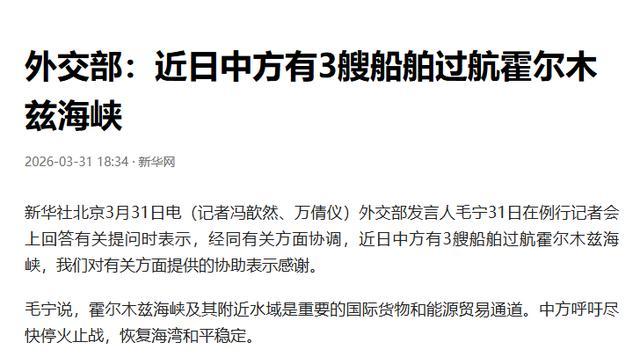 然则,就活着界列国为通过霍尔木兹海峡发愁的时辰,一个积极的音信传了出来。3月31日,中国酬酢部发言东说念主毛宁在记者会上确认,在联系方面的配合下,中方有三艘船舶成效过航了霍尔木兹海峡。