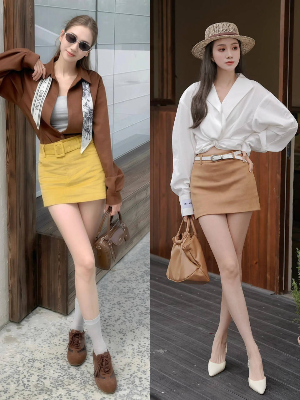 细节①:衬衫搭配短裙,呈现大长腿