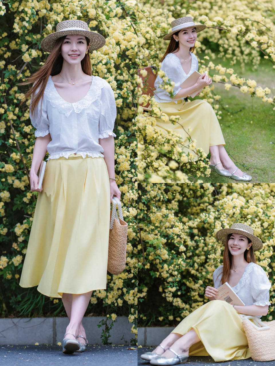 细节②:木耳边白衬衫配鹅黄色伞裙,春日氛围感拉满