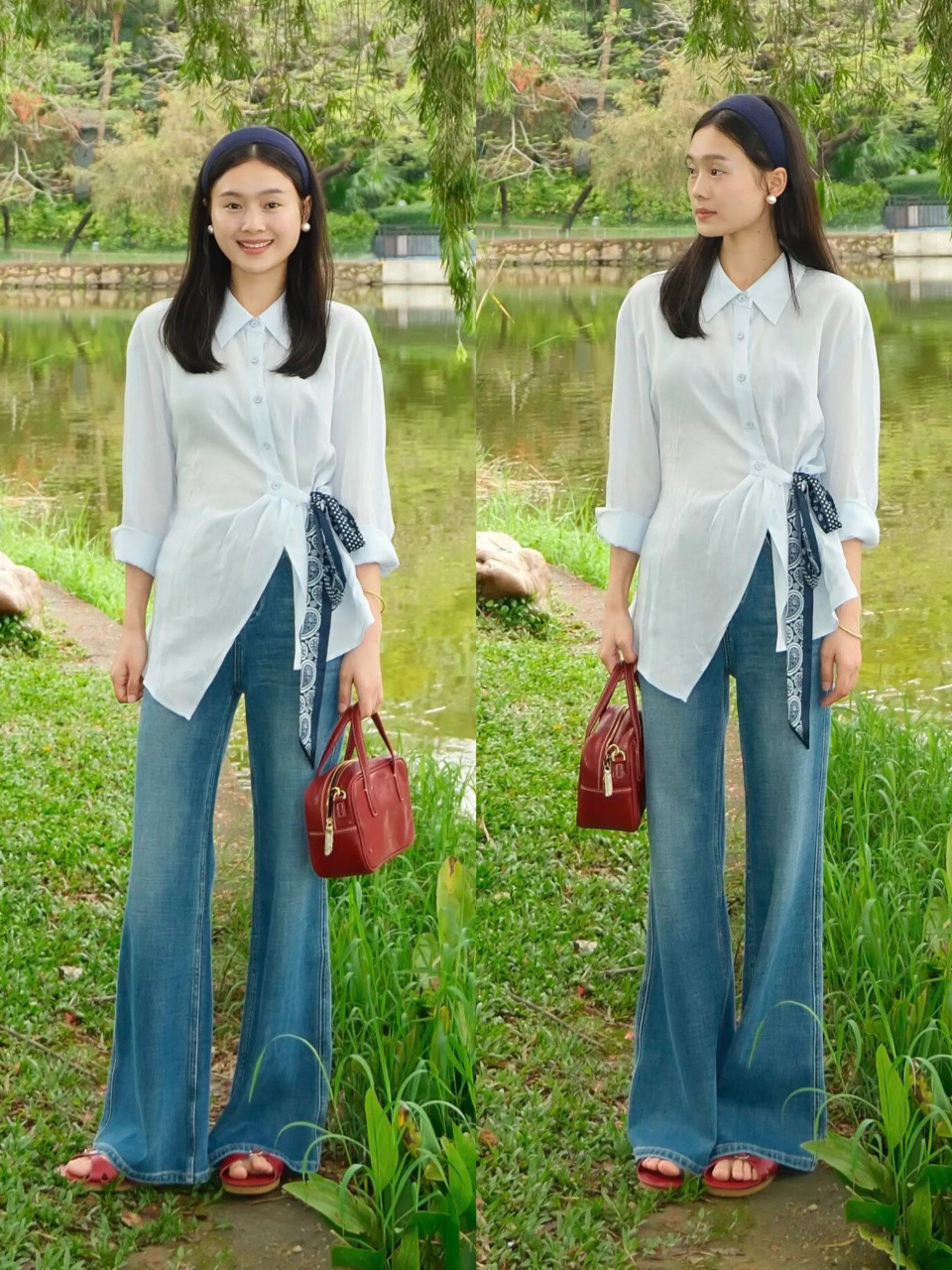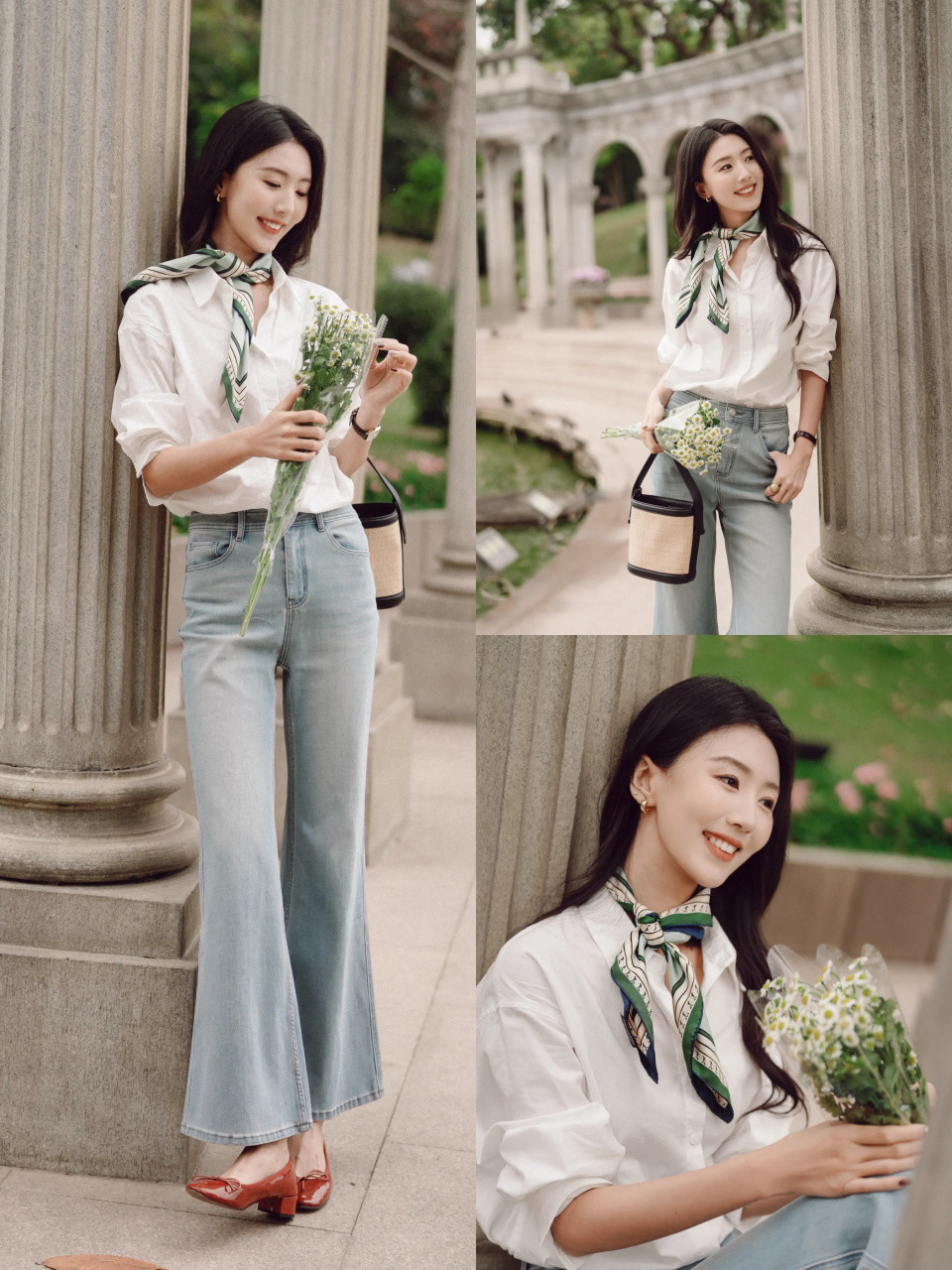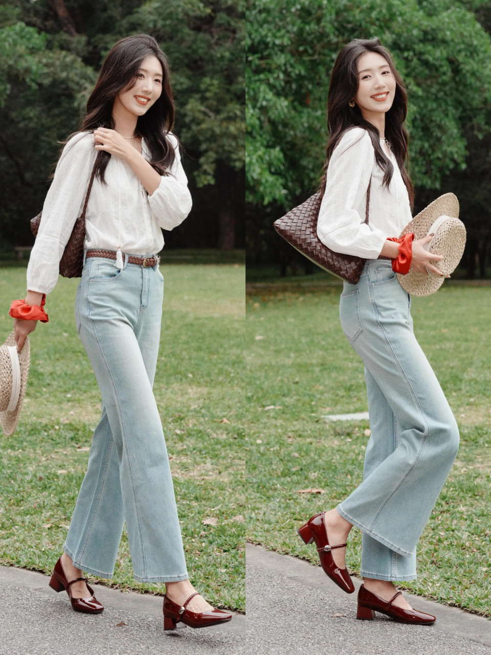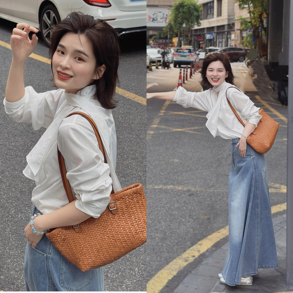 搭配一件白色的 V 领小众衬衫和蓝色的牛仔九分直筒裤,衬着一款大海潮的鬈发造型,通勤逛街、出游蚁集齐适配,圣洁让你拿合手春日的女神氛围感。