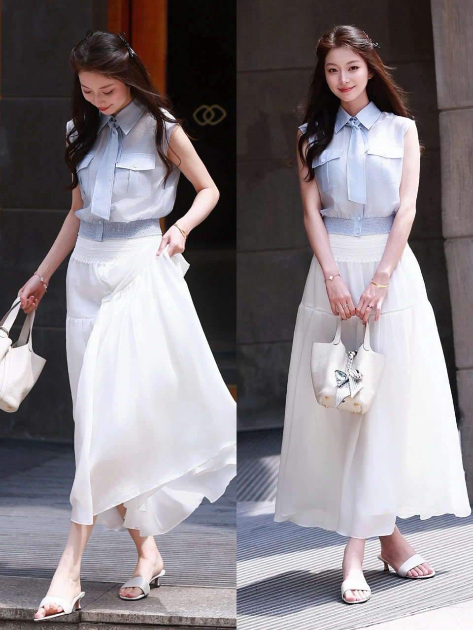 o ①:雾霾蓝衬衫+白色伞裙