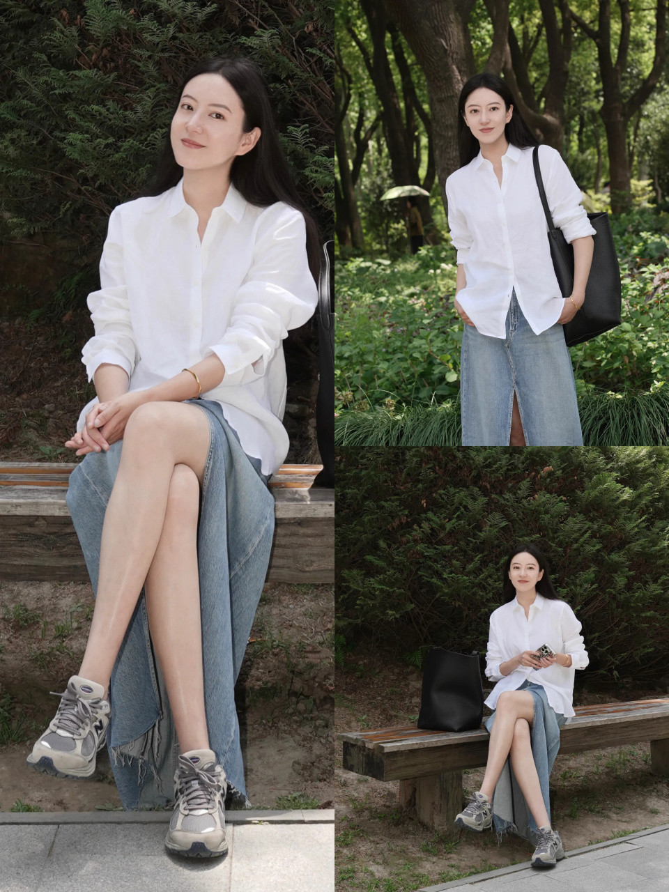 牛仔半身裙配上一件小众的白色衬衫上衣,或然穿去上班,深广出街。蚁集,旅行都显得懒散上镜。