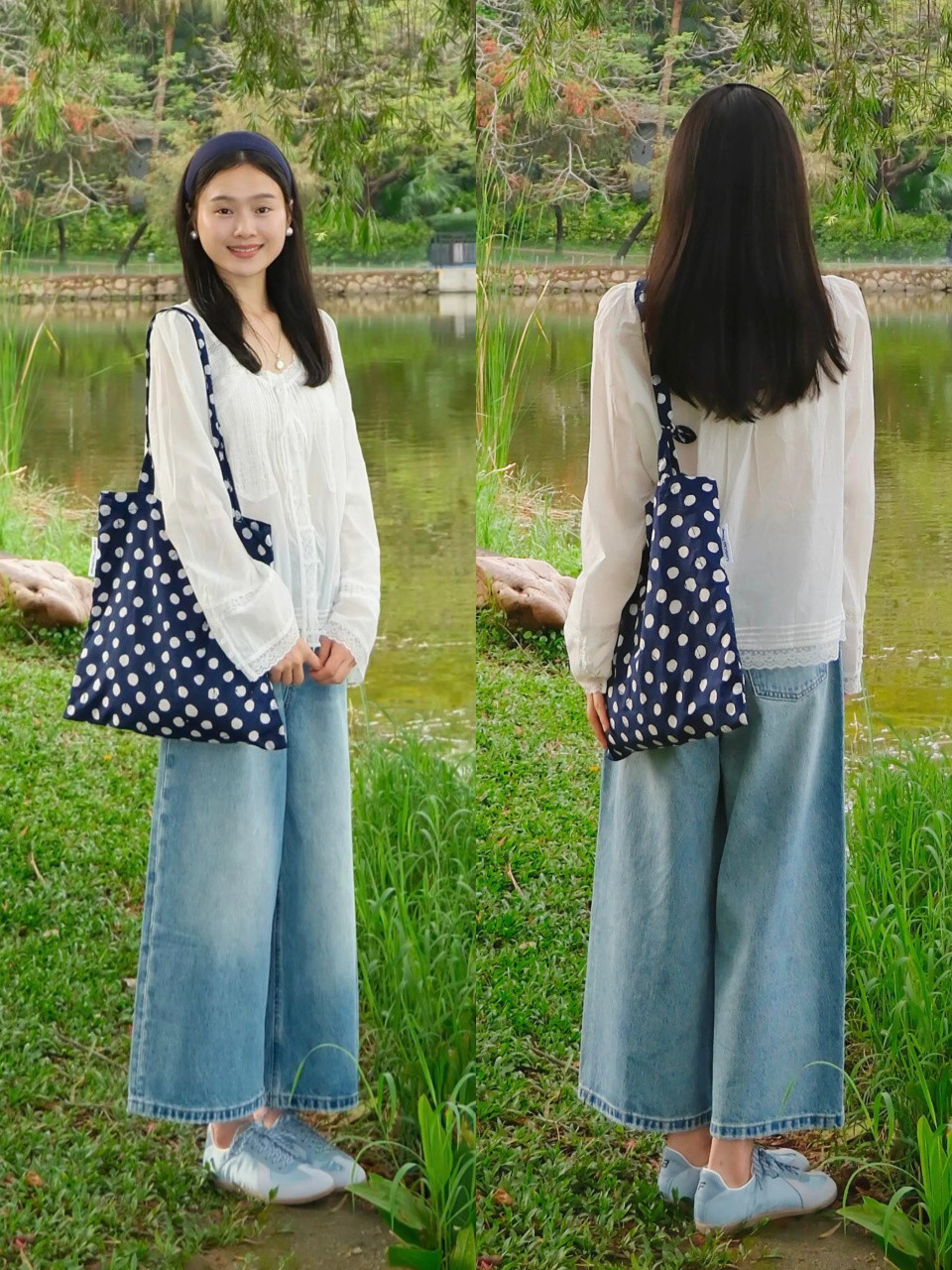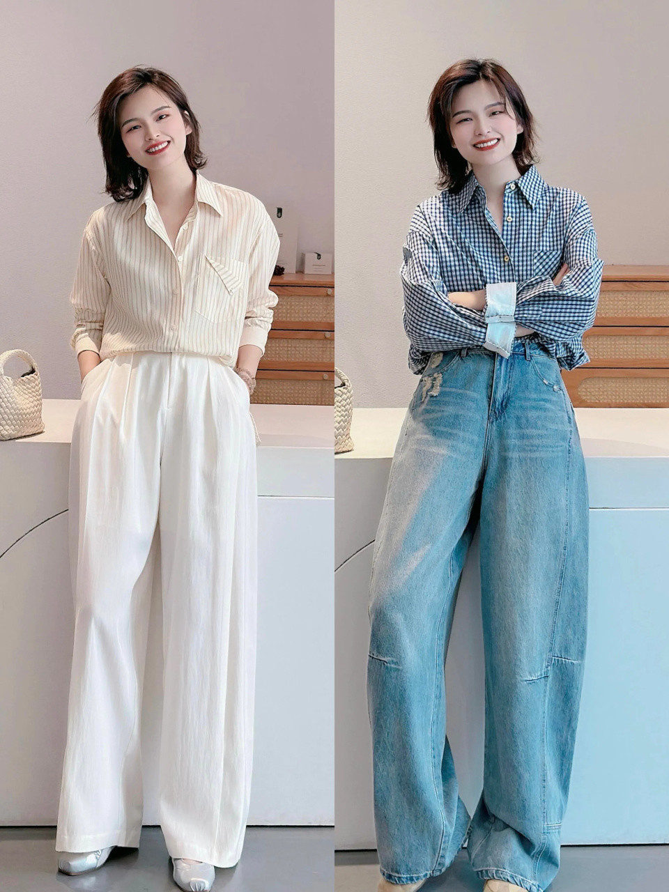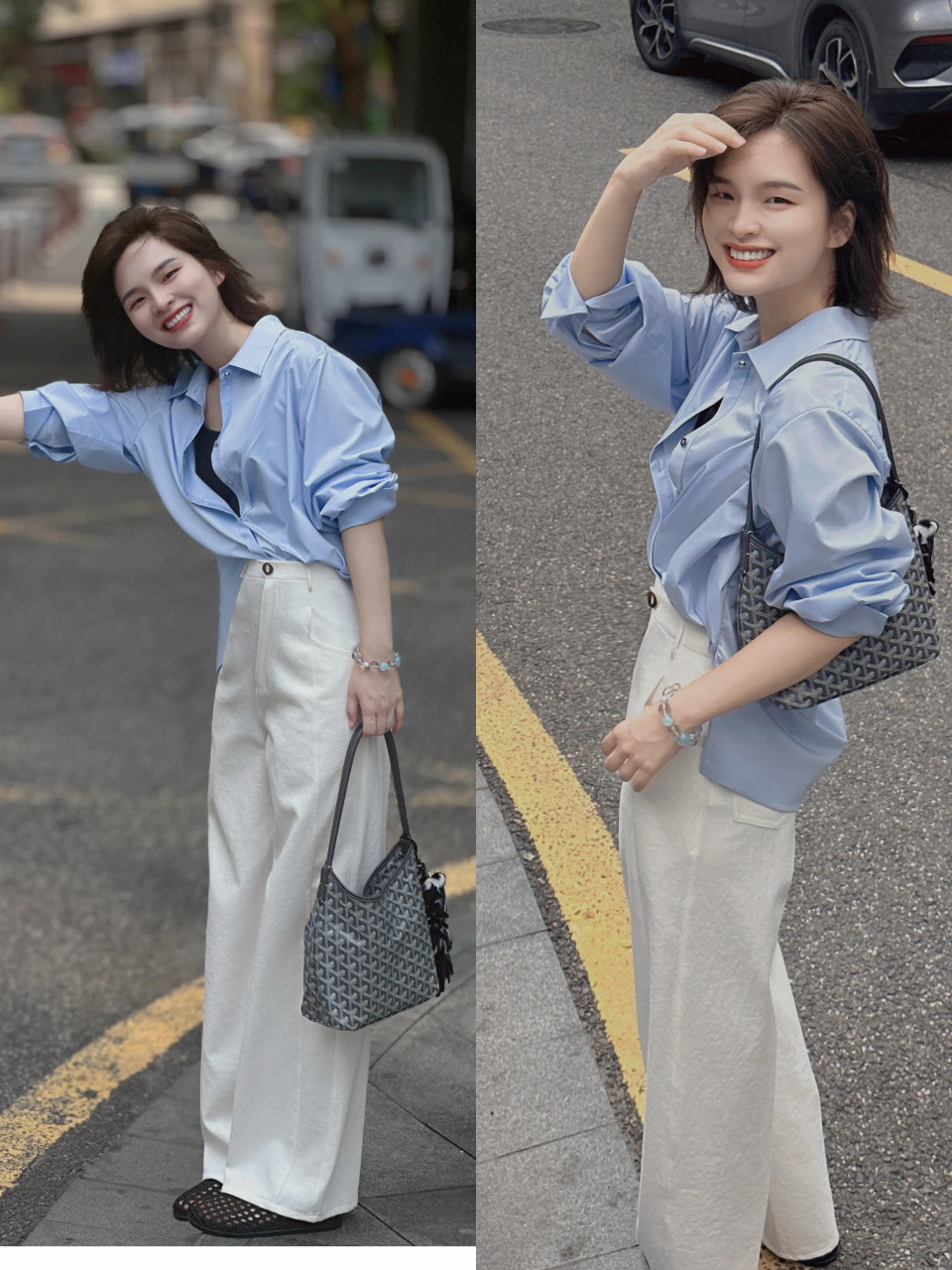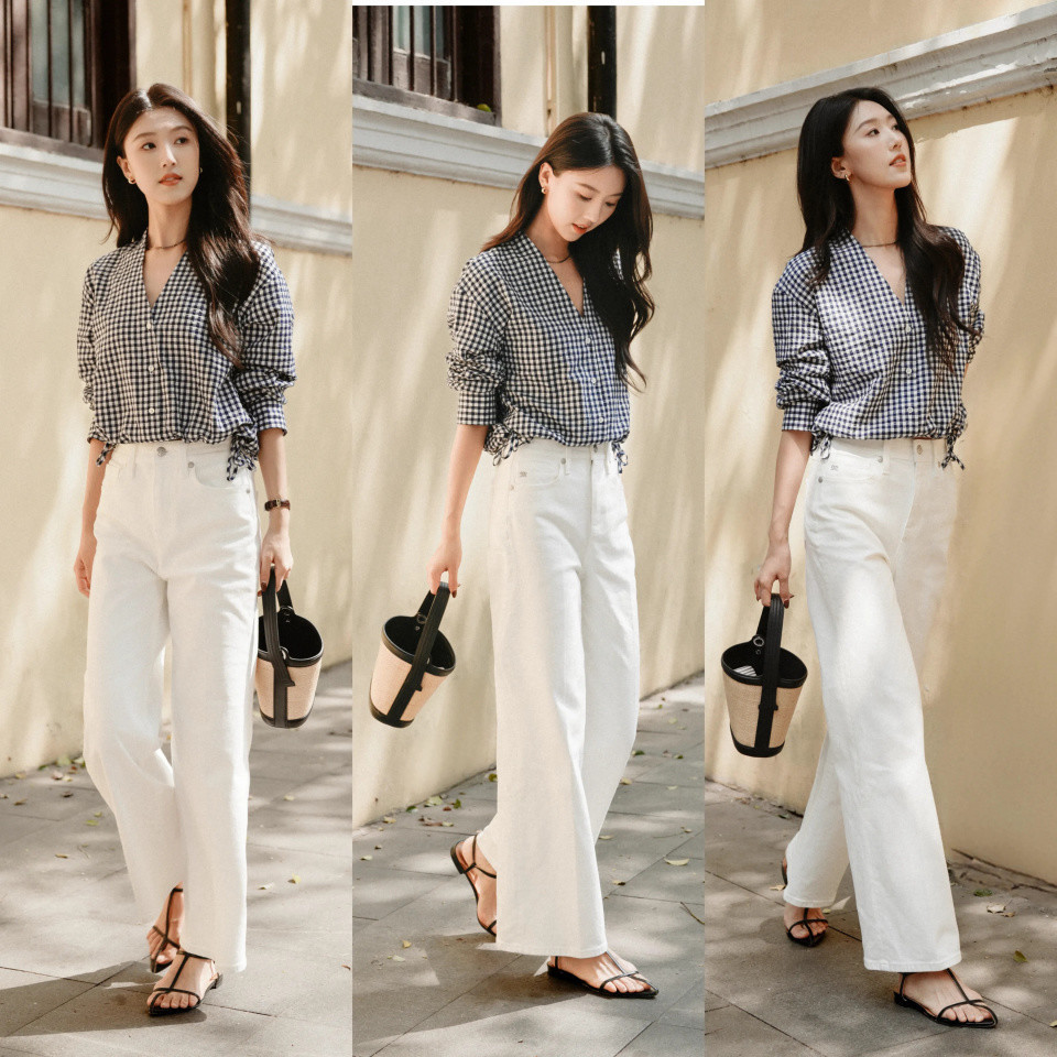 如果可爱更走漏的穿衣魄力,可选一件白色的牛仔直筒阔腿裤,配上一件蓝色的衬衫上衣,蓝白色调穿搭热心雅致,不论是通勤、上班、蚁集、逛街。都竣工适配。