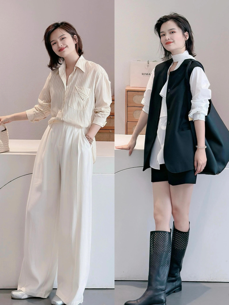 穿衣从无谓遵从潮水,合己身,衬气质即是最佳的魄力,举例上头用玄色无袖马甲叠搭白衬衫,配百慕大短裤与玄色中筒靴,又飒又好意思,利落气场自成一片。
