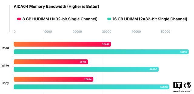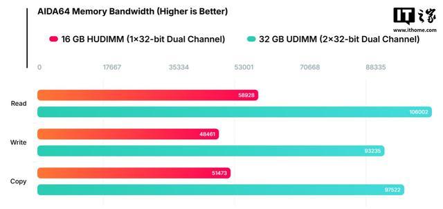 在单通说念竖立下,16GB 圭臬 UDIMM 读取带宽达 58.9GB/s,而疗养为 8GB HUDIMM 后带宽骤降至 32.4GB/s,性能跌幅接近 50%。